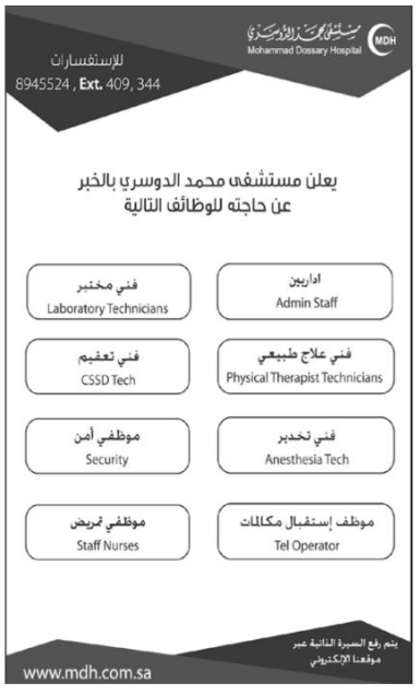 مستشفى محمد الدوسري في الخبر إداريين وفني مختبر وعلاج طبيعي وتعقيم وموظفي أمن في