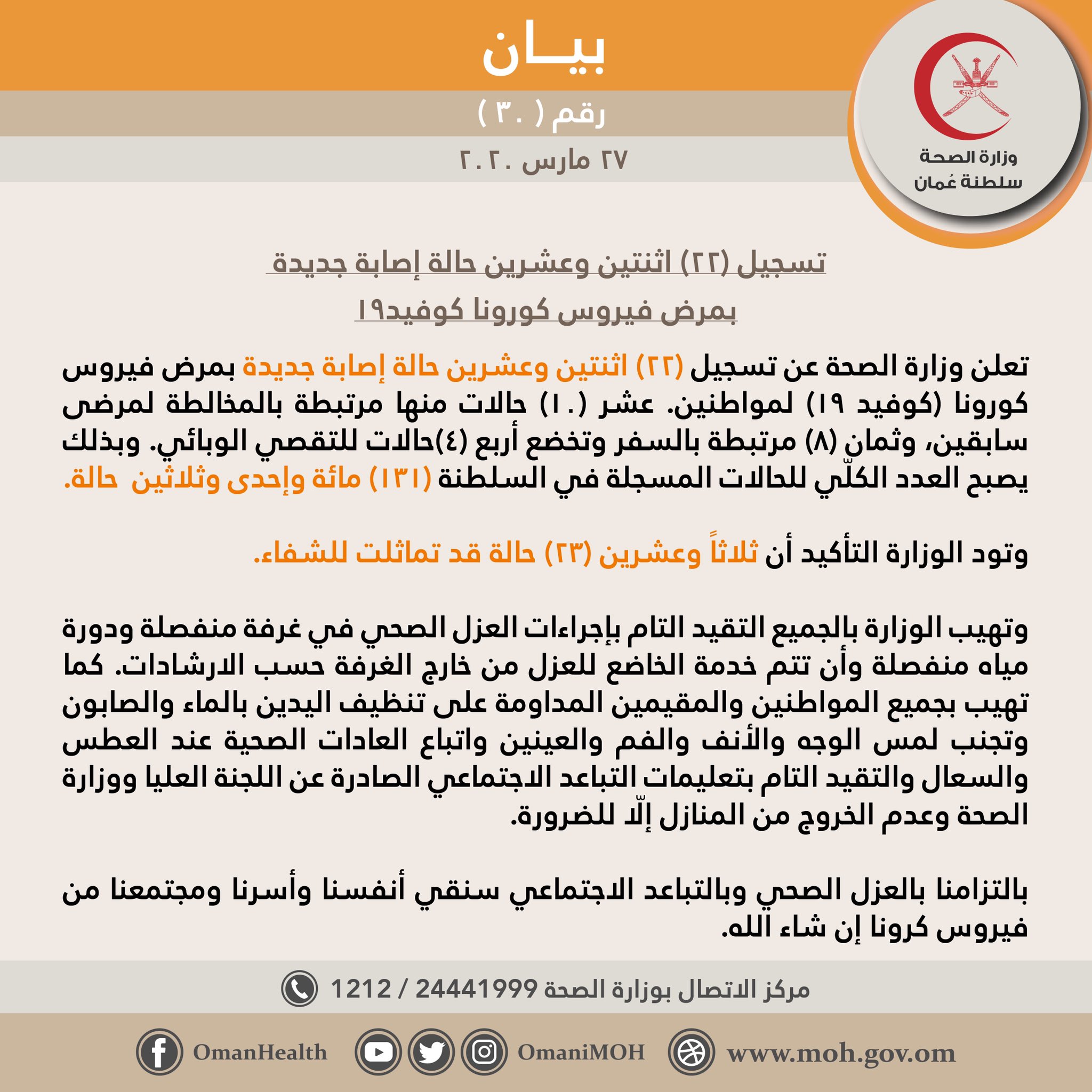 وزارة الصحة ع مان On Twitter تعلن وزارة الصحة عن تسجيل ٢٢ اثنتين وعشرين حالة إصابة جديدة بمرض فيروس كورونا كوفيد ١٩ لمواطنين عشر ١٠ حالات منها مرتبطة بالمخالطة لمرضى سابقين وثمان ٨