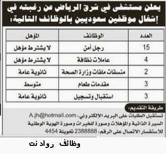 وظائف نسائية ورجالية في مستشفى شرق الرياض حراس امن ومنسقات ملفات ومقدمات طعام واستقبال وتسجيل