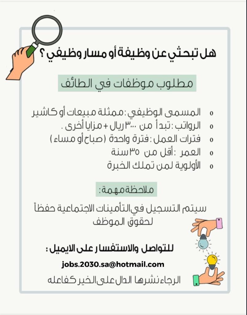 وظائف الطائف No Twitter مطلوب موظفات في الطائف كاشير بائعه رواتب تبدأ من ٣٠٠٠ العمر لا يزيد عن ٣٥ سنه للتقديم ارسال السيرة الذاتية على Taif Jop123 Gmail Com Https T Co Dcup8akz7k